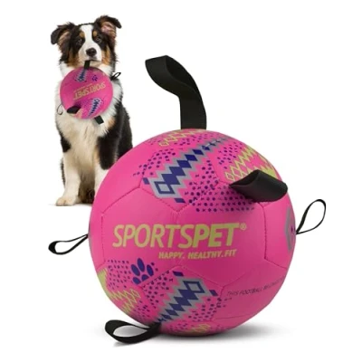 SPORTSPET Dog Football with Grab Tabs, Durable Interactive Balls, Floating Water Toy for Indoor & Outdoor Play (Size 2 Neon Pink)