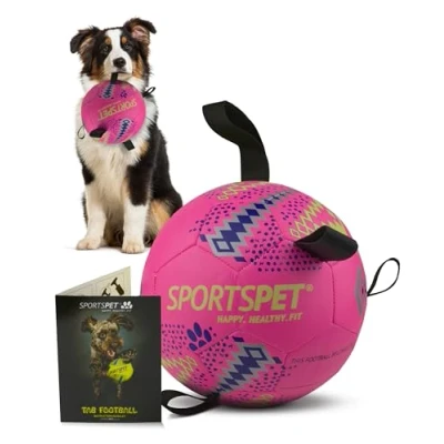 SPORTSPET Dog Football with Grab Tabs, Durable Interactive Balls, Floating Water Toy for Indoor & Outdoor Play (Size 4 Neon Pink)