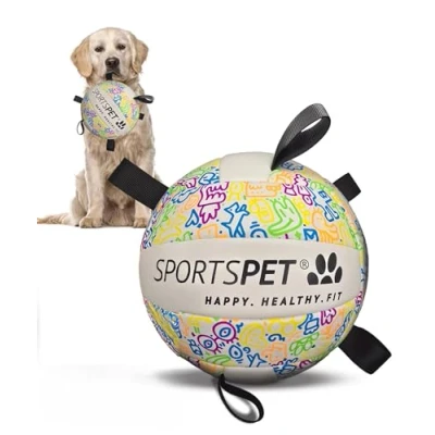 SPORTSPET Dog Football with Grab Tabs, Durable Interactive Volleyball, Floating Water To y for Indoor & Outdoor Play, Ball Birthday Gift (White XXL)