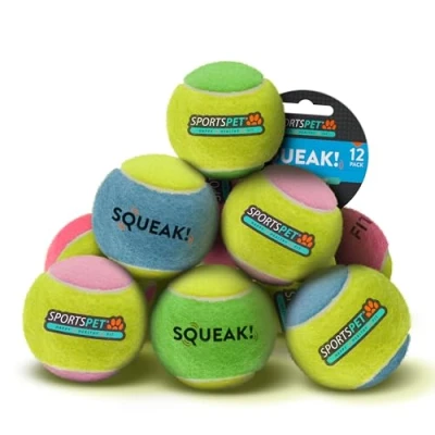 SPORTSPET Tennis Balls for Dogs Extra Bouncy Non Toxic Durable Long Lasting Floats (Squeak (12 Pack) (64mm)) P/T/A