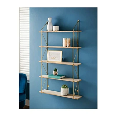 Floating decorative 5 tier Shelving Unit With Gold Metal Frame. This stylish contemporary bookcase or shelving unit can be used in any room in the house to make a great focal point in any room. Perfect for living rooms, children's rooms, or even hallways - you can turn it into the shelving unit that works for you. Very practical and useful shelving unit Create a stylish and practical shelving area in your home with this Oak wooden & Gold metal shelving unit. Clean surface with a stylish, unique, Modern & simple look The shelving unit is a valuable addition to a lounge. It offers a versatile space to rest your room. Flat pack item, Easy to assemble, clean & store - Wall hanging Design Material: Gold Metal wire Wooden Board with Wooden Oak Colour effect. Package Size: W50 x D12 x H88cm (approx.). High-quality material with a Gold colour frame finish.