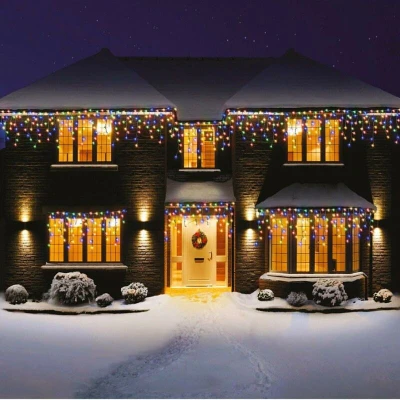 720 Multi-Colour Icicle Lights — White Cable Vibrant LED Icicle Lights with Memory Hold Function — Perfect for Indoor & Outdoor Displays 720 multi-colour icicle lights with a white cable — ideal for decorating roofs, eaves, and windows. Brighten up your festive season with this stunning set of 720 Multi-Colour Icicle Lights . Designed with a sleek white cable , these LED lights add a cheerful, colourful glow to your home or garden. Perfect for roofs, fences, balconies, or indoor displays, these energy-efficient lights create a vibrant decorative effect. The integrated memory hold function ensures your preferred lighting mode is saved, even after switching off. These lights are suitable for both indoor and outdoor use, but the power supply must remain indoors for safety. Key Features Total LEDs: 720 multi-colour LEDs Cable Colour: White Total Cable Length: 8 m Lit Length (1st bulb → last bulb): 17.85 m Power Supply: 32V, 3.6W (included) Lamp Specification: 3V, 0.015W per LED Function: