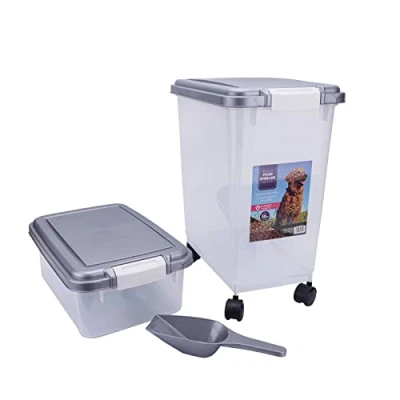 LOOKING FOR A PET FOOD STORAGE CONTAINER? dog food container? cat food storage? dog food containers for dry food? Then have a look and bring this 3 piece pet food storage containers to your home. STYLISH & STURDY PET FOOD CONTAINERS : Large dog food storage container is a sturdy item includes 1xLarge container, 1xSmall container, 1 Measuring Scoop. Cat food storage containers with clear plastic can make the visibility of food very clearly. USES & BENEFITS: Dog food bin can easily store your dry food , cereals or biscuits of dogs, cats or other animals. Dog biscuit storage containers with 12L capacity of smaller one and 27L capacity of larger one. AIRTIGHT CAT FOOD CONTAINER : Cat litter storage container keeps the food fresh and dry for a long time with an airtight seal. Food storage for dogs prevents the food from reach of insects. DIMENSIONS AND MATERIAL: Large container: W41.5xD27.5xH43CM with 1.3KG weight, Small container: W41xD28xH16.5CM with 0.6KG weight, Scoop: 26.2x9.2x4.3CM with 55G weight. Manufactured with PP plastic material.