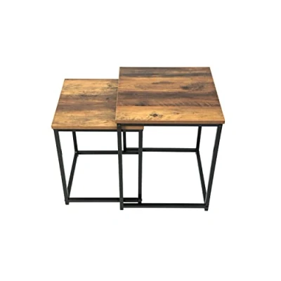 AmazonSet of 2 Square side nesting tables Shelving Unit With Black Metal Stand. This stylish contemporary coffee tables can be used in any room in the house to make a great focal point in any room. Perfect for living rooms, children's rooms, or even hallways - you can turn it into the storage unit that works for you. Very practical and useful shelving unit Create a stylish and practical storage area in your home with this wooden & metal nesting table unit. Clean surface with a stylish, unique, Modern & simple look coffee tables. An end table is a valuable addition to a lounge. It offers a versatile space to rest your room. Flat pack item, Easy to assemble, clean & store - Free-standing Design Material: 12mm Wooden Board with Paper Oak Colour effect. Product Sizes= Large: W40 x D40 x H50cm; Small: W35 x D35 x H45cm (approx.). High-quality material with a Black colour frame finish.