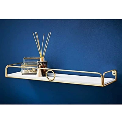 Amazon60cm Floating Wall Shelf Metal Ring Design & and wooden base Living Room, Bedroom Shelves Storage Enhance the decorative feel of your home with the Deco Glamour Shelf. Simple to mount onto wall Material: 6mm Metal Wire, 9mm MDF Shelf. Holds weight upto 3kg. Simple and Easy to clean, assemble and use Colour: White Shelf With Gold Metal Ring. Dimensions: W60xD18xH6.8cm contemporary gold ring design, and a White colour finish on this display wall shelves. Simple and Easy to clean, assemble and use All fixing are included; Maximum Load 3kg