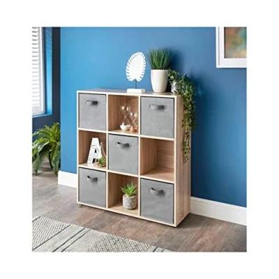 Amazon9 Cube Storage Unit With 5 Basket -Oak Perfect for displaying photos, keeping ornaments on show or keeping books, games and toys off of your kid’s bedroom floor. Perfect for living rooms, children's rooms, or even hallways - you can turn it into the storage unit that works for you. Flat pack unit, easy to assemble. Simple assembly instructions. Material: 12mm Particle Board with Paper Laminated Product Size: 89 x 28.3 x 89cm (approx.)