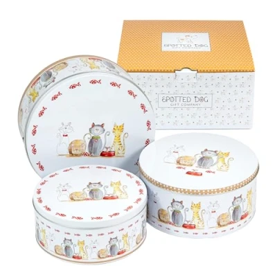 KEEP BAKED GOODIES FRESH: Our cake tin storage set features airtight lids that lock in moisture, keeping your cakes and biscuits delicious for longer. Sizes include: D: 249 x H: 110 mm, D: 218 x H: 100 mm, and D: 200 x H: 86 mm. DURABLE AND QUALITY MATERIALS: Each cake storage tin is made from 25mm sturdy tin material (thicker than average tins) - making them ideal for both storage and transportation. SPACE-SAVING BAKING STORAGE TINS: Our nesting cake storage tins are crafted to nest inside one another or stack vertically on top of the other - keeping your kitchen counter neat and organised. DECORATIVE & VERSATILE KITCHENWARE: Our round biscuit tins with cute cat designs are easy to maintain with a simple wipe clean. They are also perfect for cat treats, cat biscuits and general cat goodies! We also offer matching range of ceramic coffee mugs, kitchen canisters, aprons, tea towels and oven gloves. CAT GIFTS FOR WOMEN & MEN: Beautifully packaged in a Spotted Dog Gift Company colour-printed box, our cake tins for storage make a thoughtful present for a housewarming, birthday, or special occasion – or even as a charming treat for yourself. It's a delightful gift that’s sure to be cherished by all animal lovers.