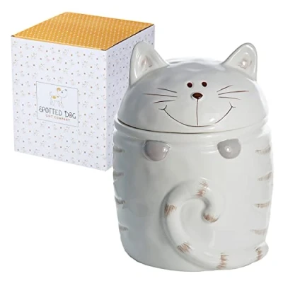 HANDCRAFTED CAT BISCUIT BARREL: Add a playful touch to your kitchen with this natural white ceramic biscuit jar featuring a cheeky cat face and peeking out paws! With tabby stripes and a swirly tail, this novelty cookie jar is bursting with personality — a purr-fect cat gift for cat lovers CAT COOKIE JAR WITH LID: Standing 21 cm high and 16 cm wide, this biscuit barrel offers a generous 1.4 L capacity — ideal for biscuits, cookies, flour, sugar, pasta, rice, or cat treats. The snug lid with silicone seal helps keep contents fresh VERSATILE STORAGE JAR FOR EVERYDAY USE: A standout among biscuit tins & jars and storage jars & canisters, this design brings fun and function together. Perfect for biscuit storage, it also makes an adorable cat food container and a cute cat treat jar MATCHING CAT KITCHENWARE & EASY CARE: Made from ceramic material, this biscuit barrel is easy to clean by hand washing in soapy water. Coordinate with matching storage jars, kitchen utensil jar, and other cat themed gifts from our collection READY-TO-GIFT: Packed in a quality Spotted Dog gift box, this cute cookie jar makes a thoughtful cat gift for cat lovers, cat gifts for women, or crazy cat lady gifts. Ideal for birthday gifts, Christmas presents, pawsome cat mum gifts