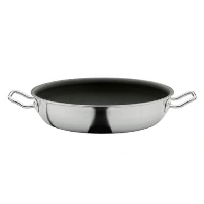 Dimensions: 28.0 cm diameter | 6.1 cm height 5-layer multi-layer material with aluminium core Exterior: stainless steel 18/0 – suitable for induction cookers, interior: stainless steel 18/10 – robust and hygienic Innovative surface with natural non-stick effect Suitable for all heat sources, including induction