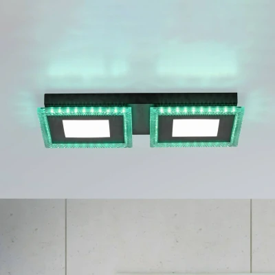 White and coloured light can be switched separately: Acri LED ceiling light with remote control, CCT, RGB, dimmable The Acri LED ceiling light made of iron is composed of two flat main shades that produce white light and serve as general lighting, as well as the modules arranged around the edges that shine in different colours. White and coloured light can be switched and controlled separately. While the colour temperature of the shades in the centre can be adjusted from warm white to universal white, numerous light colours are available for the decorative modules at the edges. Everything is controlled via the included remote control (incl. 2 x AAA batteries) and thus the intensity can also be dimmed as desired. Technical features / special features - Including remote control (incl. 2 x AAA batteries) - White light (2,700 - 5,000 K) and RGB accent lighting can be switched separately - Dimmable via remote control
