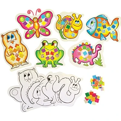 A pack of pre-printed and shaped creature cards along with a bumper pack of patterned and glitter mosaic pieces Structured activity with lots of scope for creativity Mosaic size: 2.5cm easy for little fingers to grip