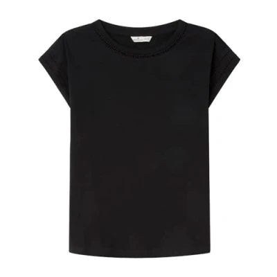 Plain T-shirt with short dropped sleeves round neck and tonal lace details on the sleeves.
