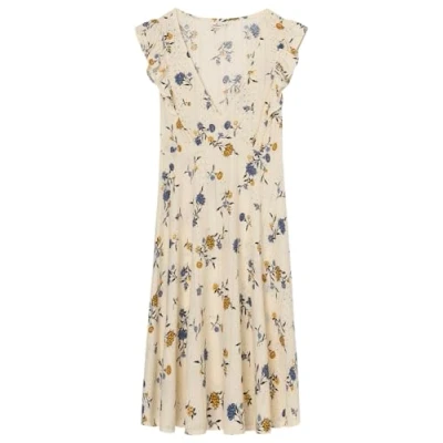 Short sleeveless printed dress with V-neck seamed waist with circular Swiss embroidery and flounced skirt. and flounced skirt.
