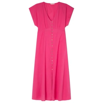 Midi dress with short dropped sleeves V-neck seam at the waist front buttons and flounced skirt.