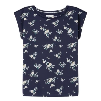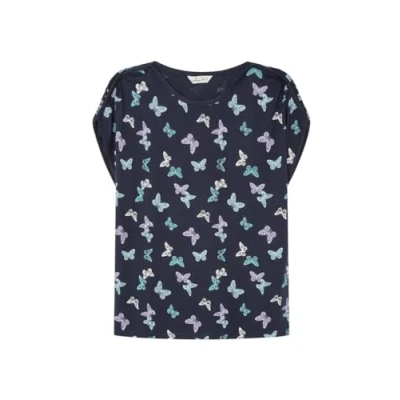 Printed T-shirt with short dropped sleeves round boat neck and gathered details at the shoulders. and gathered details at the shoulders.