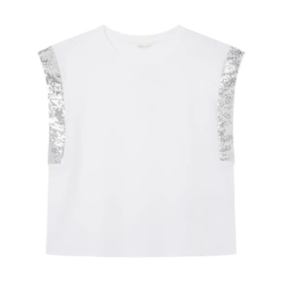 Plain T-shirt with short dropped sleeves round neck and sequinned detail on the sleeves. and sequinned detail on the sleeves.