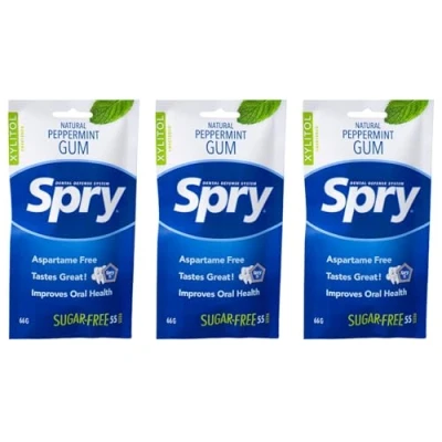 ON THE GO PEPPERMINT GUM: Spry peppermint gum will help to keep you breath smelling fresh and is moisturizing for your mouth. It’s the ideal freshen up gum that is also good for your teeth. Our gum is conveniently packed so you can stay fresh on the road, at work, or with your friends. The natural peppermint gives a blast of cool, refreshing flavor, which provides a nice alternative to other aspartame free gum. IMPROVES TOOTH DENTAL CARE: Clinical studies have shown that the use of xylitol on a daily basis may reduce the risk of tooth decay. Our Spry gum is part of an essential dental defense system that may also help fight off cavities. Xylitol is a natural ingredient that inhibits contaminants' ability to stick to your teeth. When contaminants can't stick, they can't colonize. Ask your dentist and hygienist about the amazing benefits of xylitol. SUGAR FREE XYLITOL GUM: Instead of corn syrup or sugar our gum is made with 100% xylitol. Xylitol sweetener is derived from the fibrous parts of plants, similar in taste to regular organic sugar. We use no filler, flow agents or other sugar additives. Xylitol is a natural sugar that tastes just like real sugar and a great choice when looking for sweetners and sugar alternatives. NON-GMO GLUTEN FREE NATURAL GUM: Unlike other packs of gum, Spry gum uses natural ingredients that are Non GMO and gluten free. Spry Xylitol gum is 40% lower in calories than other mint gum that contain regular sugars, but contains the same sweetness. It can be a great choice for using in foods and snacks, keto friendly foods or used in sugar support supplements. FIGHTS BAD BREATH: Use daily after meals and between normal brushes. For best results use Spry Peppermint Gum with Spry Coolmint Toothpaste and Spry Coolmint Oral Rinse for a fresh breath.Spry Peppermint Chewing Gum can help prevent bad breath caused by a poor pH balance, dry mouth, and the lack of saliva. Chewing xylitol gum after meals can increase your saliva output and help neutralize the acids that cause bad breath.