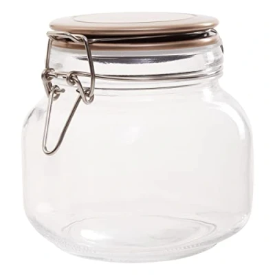 ManoManoGeneral description Made from clear glass, this square jar is ideal for preserving dried goods, pickles, or jams. The jar features a champagne finish metal lid that is secured with a clip lock, ensuring that contents remain airtight and fresher for longer. Technical specifications Capacity: 800 ml