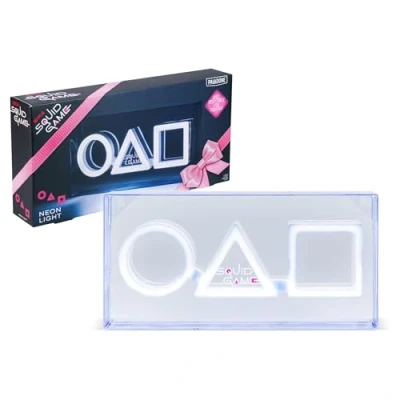 SQUID GAME: Brighten up your space with the Squid Game LED Logo Neon Light, featuring the iconic shapes from the hit Netflix series. ON DISPLAY: Freestanding or wall-mountable, this neon light measures 15cm (5.9") tall and 30cm (11.8") wide, perfect for any setup. USB POWERED: Conveniently power your neon light with the attached USB cable, making it easy to use in any room. PERFECT FOR FANS: Ideal gift for Squid Game fans or collectors, this statement piece showcases a piece of the nail-biting hit Netflix TV series PALADONE: At Paladone, we specialize in fun gifts for fun people. Our officially licensed merchandise includes top-selling toys, decor, and unique items that bring joy to all nostalgic pop culture enthusiasts. Discover magical gifts that make every fan's collection.