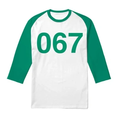 Squid Game Player 067 Unisex 3/4 Baseball T Shirt, White/Kelly, X Large