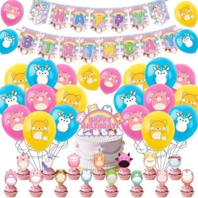 Squishmalow Birthday Party Decorations, 35PCS Decorations Happy Banner Balloons Cake Topper Cupcake Toppers Spiral for Kids Girls Boys Theme Decoration Supplies