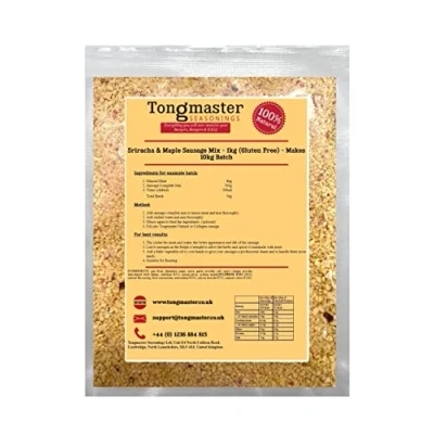 A blend of garlic and sriracha chilli with the sweetness of maple - perfect with pork or chicken. Use 1kg mix per 9kg minced meat, includes rusk. This pack will make 10kg of sausages. Use with beef, chicken, pork, lamb or alternative! Simply add this seasoning to minced meat & water. Fill the sausage meat into collagen or natural casings using vegetable oil for a professional sheen. The colder the meat and water, the better the appearance and life of the sausage. Leave sausage meat in the fridge overnight to allow the herbs and spices to marinade with the meat. Fill using a sausage stuffer machine.