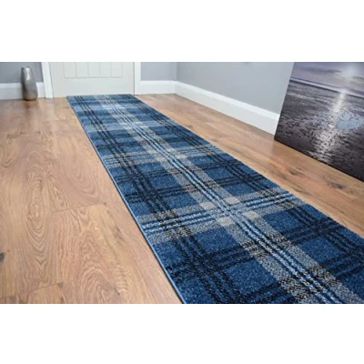 SrS Rugs® Glendale Collection Tartan Long Carpet Runner Rug for Hall and Stairs, 67cm wide, Made to any length (Blue, Length: 4' (122cm))