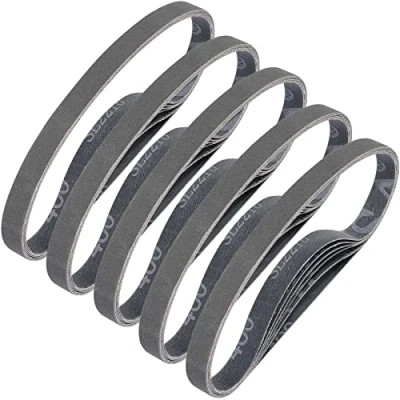 Pack contains 30Pcs 13X457mm sanding belts, silicon carbide grain | Closed coat | Heavy duty Y-weight polyester cloth backing Wet or dry applications | Silicon Carbide sander belts ideal for knife sharpening, metal working, glass, stone, granite, cement, composites, plastics and light metal finishing Precision engineered bi-directional tape joint, diagonal lap splice eliminates splice bump, sanding belts interface is firm and not easy to break under pressure Anti-clogging stearate to reduce heat and buildup | Resin over resin bonding for long belt life, quality craft allow the sand grit even, not easy to fall down Available in a wide range of common grit: 60/120/240/400/600/800 grits, you can choose freely the abrasive belt with the coarse grits or fine grit sanding belts according to your needs