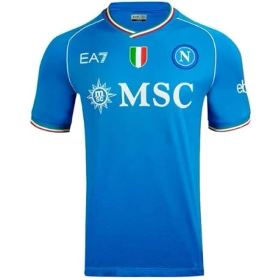 Official product SSC Napoli The SSC Napoli, in collaboration with EA7, presents the Gara Home jersey for the 2023/2024 sports season; for the club it is the beginning of a new era and the pillars on which it is based are, on the one hand, the strong bond with its own city, on the other the presence of Napoli fans The Replica Home shirt features a raglan sleeve styline, contrasting white piping, cross V-neck with tricolour print as on the bottom of the sleeve, allover "N" pattern with silicone Napoli logo patch and custom tricolour shield on the chest Great item as a gift or to show your blue passion at the stadium The Replica shirt has a certilogo sewn inside to check the official nature of the product