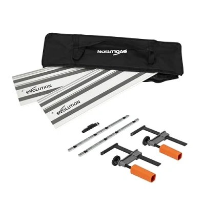 Universal compatibility - Works with most circular saw brands, including Makita, Bosch, Festool, Triton, Metabo, Scheppach, Erbauer, Titan and all Evolution circular saws with an "X" in the name. Ideal for chainsaw systems, woodworking, cabinet making, and precision plate cutting. PRECISE CUTTING WITH CNC-LIKE ACCURACY 4 FT guide rail ensures perfectly straight and precise cuts through plywood, MDF, OSB, laminate and solid wood panels, reduces material waste and improves efficiency. SELF-ALIGNING CONNECTOR RODS - Patent pending 1/4 turn cam connectors for gap-free alignment, provide seamless track extensions for crack cuts, cross cuts and plunge cuts with ultimate accuracy. STABILITY & DURABILITY Features grippy rubber traction strips, an improved sacrificial edge strip, and an additional lubricating strip for smooth sawing action, secure grip and reduced friction on various surfaces. COMPLETE KIT WITH ACCESSORIES Includes 2 x quick release clamps, self-aligning connectors, a carrying case and a 3mm hex wrench, making it a portable and professional cutting solution., Weight: 9.0 Pounds, Manufacturer: Evolution Power Tools