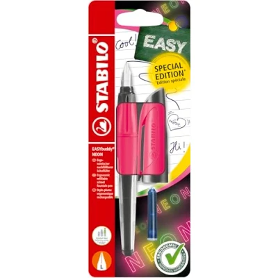 STABILO EASYbuddy Neon Ergonomic School Fountain Pen L Nib Left Handed Pack of 1 Pink including Blue Ink Cartridge