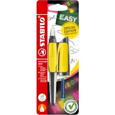 STABILO EASYbuddy Neon Ergonomic School Fountain Pen L Nib Left Handed Pack of 1 Yellow including Blue Ink Cartridge