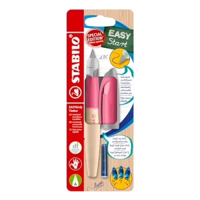 STABILO Ergonomic School Fountain Pen EASYbirdy Timber A Nib (Beginner) Right Handed Pack of 1 Pink with Erasable Blue Ink (Inc. Cartridge)