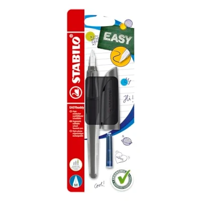 STABILO Ergonomic School Fountain Pen EASYbuddy Twilight Sky M Nib (Medium) Pack of 1 Black/Black with Erasable Blue Ink (Inc. Cartridge)