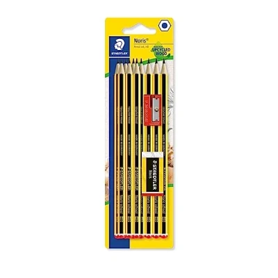 High quality pencil for drawing, sketching, shading and writing Break-resistant through special lead formulation and super-bonded lead Ideal for school and office use Wood sourced from certified, sustainably managed forests Pack of 10 HB Noris pencils with sharpener and eraser