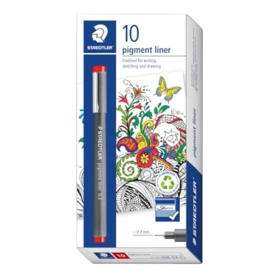 STAEDTLER 308 03 2 Pigment Liner Fineliner Pen for Writing & Technical Drawing Red, 0.3mm (Box of 10)