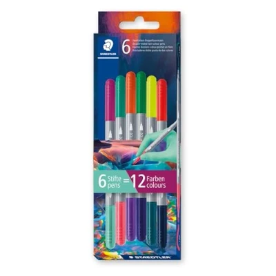 Fibre-tip colouring pens with two different colours each, providing a variety of 12 colours in the pack Line width fine tip approx. 1.0mm, line width broad tip approx. 3.0mm Water-based ink that washes easily out of most textiles Ventilated cap conforming to ISO 11540 and BS 7272-1/2 Card pack of 6 double-ended colouring pens in 12 assorted colours
