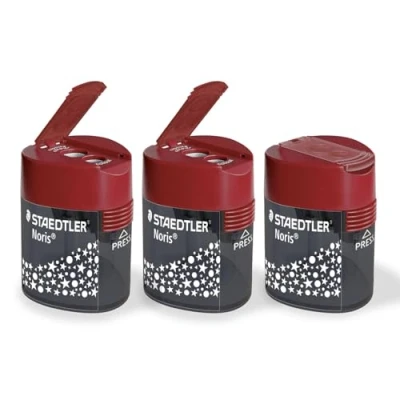 Practical set of 3 - With three double sharpeners, you are perfectly equipped for school, office and home and always have a replacement sharpener at hand Two pointed holes - The sharpeners have openings for pencils up to 8.2 mm and 10.2 mm in diameter and are ideal for thin and thick lead and coloured pencils Precise tip angle - With a sharp angle of 30 degrees, wide and soft lines are created, perfect for painting, drawing and creative writing Metal tip insert - Durable blades ensure even and clean sharpening, so that your pens stay usable for longer and always ready to use Lid with push buttons - The secure closure prevents sharp waste from leaking and protects against accidental opening in bags or pencil cases