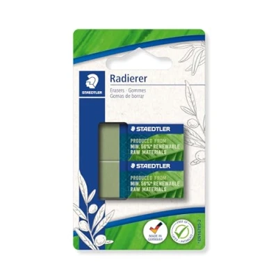 Made from up to 56% natural and renewable raw materials Phthalate and latex free Eraser quality made in Germany Sliding cuff made from 100% natural material for comfortable handling Box contents: 2 olive green erasers on blister card