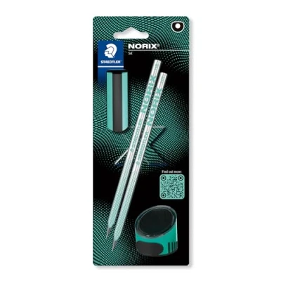 New high-quality graphite pencils in innovative & unique shape for relaxed and comfortable sketching, drawing & writing Stylish black-coloured wood pencil with metallic surface Soft non-slip surface and high break-resistance lead Produced using upcycled wood content from sustainably managed, certified forests Pack of 2 x NORIX HB pencils, 1 x single-hole tub sharpener & 1 x eraser in french green