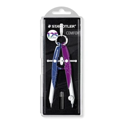 Precision geometry compass with spindle guide, round spring head and centre drive spindle Sturdy plastic metal construction allows drawings that are accurate and precise Maximum diameter of the drawing circle: approx. 225 mm Replaceable lead insert Box contents: Mars Comfort 556 Mars Anniversary Compass