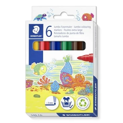 Cap with breathing air duct according to ISO 11540 and BS 7272-1/2 Specially designed for small children's hands Ideal for large-scale painting Ink with water based food dyes Box contents: cardboard case with 6 jumbo felt tip pens in assorted colours