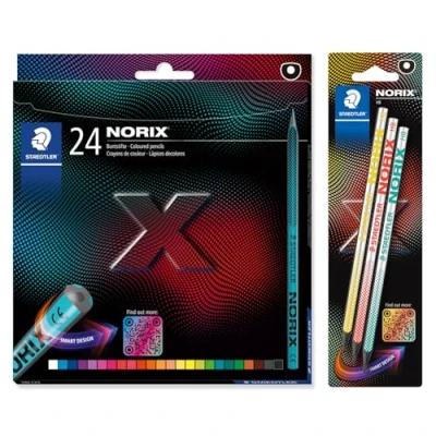 Norix - the new 10+ range in a unique shape Non-slip soft surface and high break resistance for writing, drawing and sketching. Responsible use of raw materials - Made from remanufactured wood chips Wood content from PEFC certified, sustainably managed forests. Box contents: cardboard case with 24 coloured pencils in assorted colours and blister card with 3 pencils in assorted colours