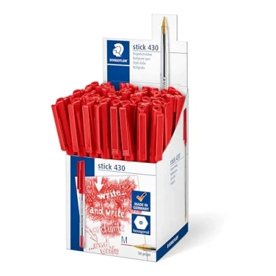 Stick 430 ballpoint pen with cap and clip Medium linewidth Box of 50 ballpoint pens with red ink Airplane-safe - automatic pressure equalization prevents pen from leaking on board aircraft High quality handwriting pen