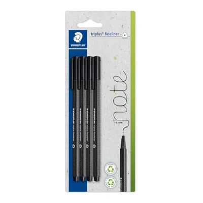Fineliner with superfine, metal-clad tip in ergonomic triangular shape for relaxed and easy writing DRY SAFE - can be left uncapped for days without drying up Water-based ink that washes easily out of most textiles Housing made of 97% recycled plastic according to ISO 14021 Pack of 4 triplus fineliner pens in black