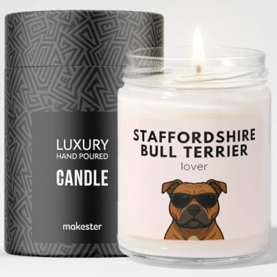 Staffordshire Bull Terrier Gifts Luxury Soy Wax Candle Vanilla, Jasmine, Sugared Almond Dogs in Shades Makester