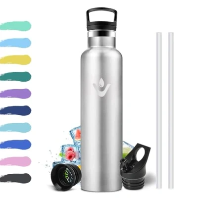 Stainless steel water bottle 1 litre: no longer rely on cheap plastic water bottles that can crack, our stainless steel water bottle is made of durable materials for a bottle that can withstand the toughest workouts. The 1 litre thermos bottle is reusable and easy to clean. It is suitable for different occasions - in the office, camping or school. 2 interchangeable lids:(1) straw lid: you can easily drink water/drinks without removing the lid, the 50 mm opening ready to put ice cubes in the bottle in summer, suitable for sports and outdoors. (2) Handle cover: This cap comes with a carrying ring and a removable filter. It can block herbal teas, fruits and ice cubes or anything when you drink. 18/8 premium stainless steel bottle: cheap plastic bottles release chemicals and change the taste, this bottle does not change. The 1 litre stainless steel drinking bottle is made of high-quality 18/8 stainless steel, which is strong, oxidation and corrosion resistant. Food-grade stainless steel does not take on smells or flavors. It is antioxidant, corrosion-resistant and free from BPA, phthalates, lead and other harmful substances - for safe and healthy drinking. Double insulation: thanks to the double-walled vacuum insulation, your favourite drink in this 1 litre stainless steel water bottle will stay hot or cold for hours. Whether summer heat or winter cold – always enjoy your favourite drinks at optimum temperature. Also carbonated drinks stay fresh for a long time. Durable and practical: This reusable bottle reduces the need for disposable plastic bottles and is an ideal choice for a sustainable lifestyle. The robust design is not only advantageous but also durable.