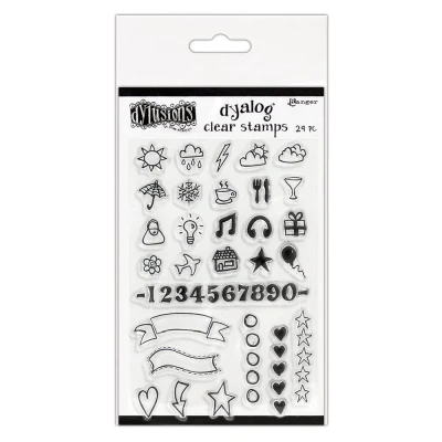 The Full Package Dylusions by Dyan Reaveley - Dyalog Clear Stamp Sets Dylusions Dyalog Clear Stamps are the perfect way to add sentiments, doodles, icons, and more into your Dyalog Insert Books! These clear stamps feature original artwork from Dyan Reaveley and work great with Dylusions Inks. Available in six sets, each stamp set measures 4" x 6". DYB65395 MPN DYB65395