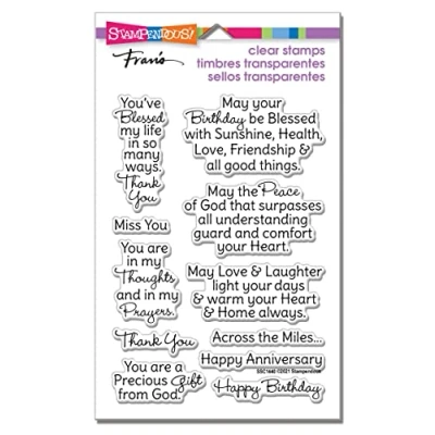 So many thoughtful, blessed messages to use for multiple occassions throughout the year. 11 stamps. This Large 4 X 6 inch set of Perfectly Clear Stamps features premium photopolymer images from exclusive Fran Seiford artwork. Interactive images work together for dozens of fun looks. Use with acrylic handle sold separately. Made in the USA