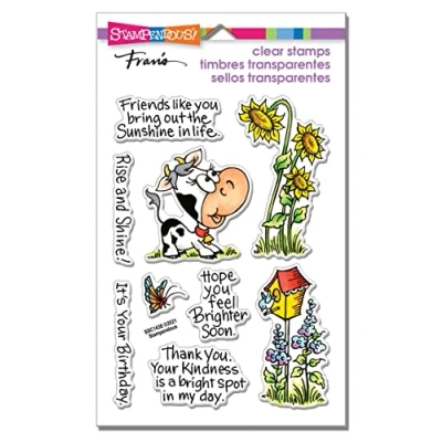 Adorable, fanciful cow, sunflowers and birdhouse bring out the sunshine for cute cards and projects. 9 stamps. This Large 4 X 6 inch set of Perfectly Clear Stamps features premium photopolymer images from exclusive Fran Seiford artwork. Interactive images work together for dozens of fun looks. Use with acrylic handle sold separately. Made in the USA